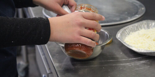 While the dough was being prepped, the students prepared their red sauce. In order to make the sauce they placed a pot over heat and poured it in. While the sauce was heating they continuously stirred it till done.